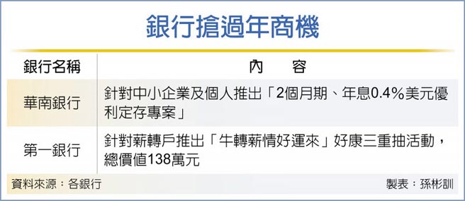 开春新年之际,公股行库抢商机。华南银行特别针对中小企业及个人推出「2个月期、年息0.4%美元优利定存专案」,以优于市场的利率水准吸引客户。第一银行「薪转户专区」则是上线满周年,即日起至3月31日止,推出优惠活动,总价值高达138万元。
