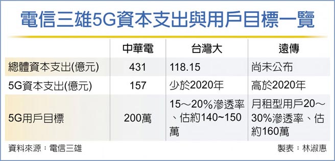 至于5G网路资本支出,中华电2021年将重砸157亿元,台湾大包括行动、固网、宽频上网、数位电视及电子商务等业务的资本支出合计118.15亿元,其中,5G资本支出低于2020年。远传预定法说会公布2021年资本支出,其中2020年5G资本支出约落在62亿元,2021年预期将高于2020年,电信三雄2021年投资在5G网路建设的资本支出,合计预期上看300亿元。
