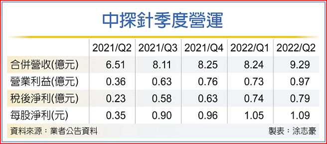 连接端子厂中探针(6217)受惠于美系大客户MagSafe充电端子提前备货,以及电动机车充电探针出货畅旺,第二季合併营收9.29亿元创歷史新高,归属母公司税后净利0.79亿元为歷史次高,每股净利1.09元。中探针新能源事业布局有成,下半年电动车相关充电探针开始出货,业绩将进入成长爆发阶段。