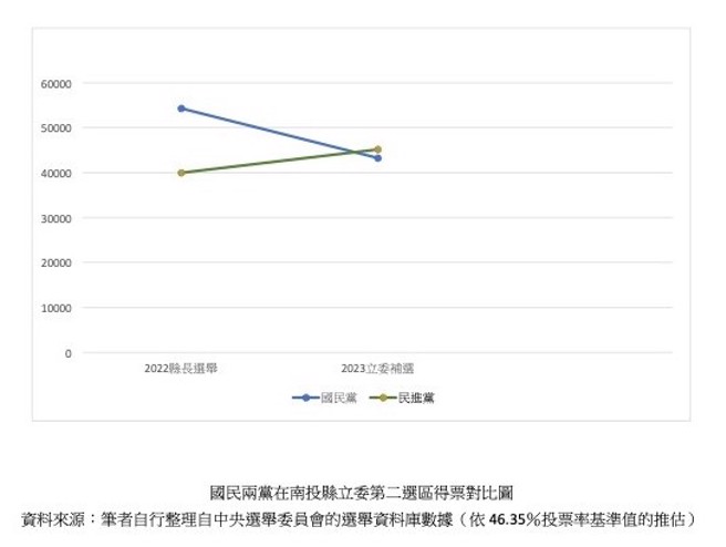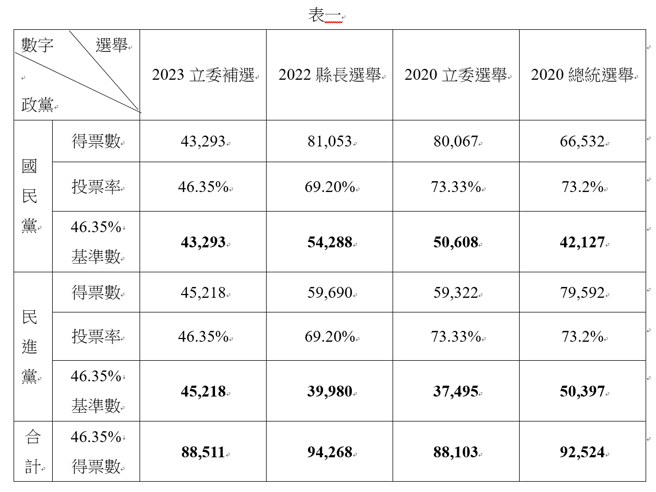 如表一所示,南投县第二选区有4组数据,依时序(1)2023年的立委补选,(2)2022年县长选举,(3)2020年立委选举及(4)2020年总统选举。其中,国、民两党的得票情形,2020年立委与总统是同时投票,结果是国民党赢立委,民进党赢总统,选民投票行为是出现分裂投票现象,是种候选人取向的投票,而非政党取向。而2022年与2023年这两党选举,仅事隔不到4个月,结果是国民党赢了2022年的县长选举,而民进党是赢了立委补选,可见选民投票行为是分裂投票,依选民的自我选择意识,而不依政党取向来投票,使得候选人的人格特质、能力及形象之优劣卓越与否,成为中间选民的投票重要考虑因素。