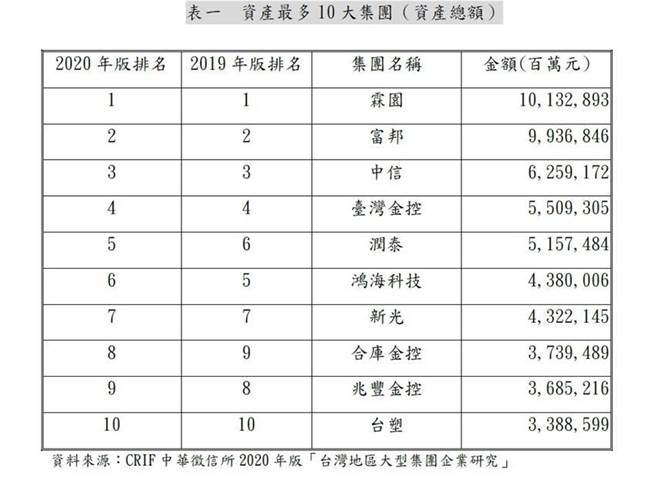 CRIF中华徵信所最新统计台湾300大集团各项财务数据,以资产总额来看,300大集团在2019年成长6.29%,再度创下115兆3,682亿元的歷史新高,前10大集团由霖园集团蝉联榜首,合併资产总额突破10兆元大关,以10兆1,329亿元再度写下台湾集团史新高。富邦集团则连续两年资产成长率达10%以上,亦以9兆9,369亿元的歷史新高紧追在后。