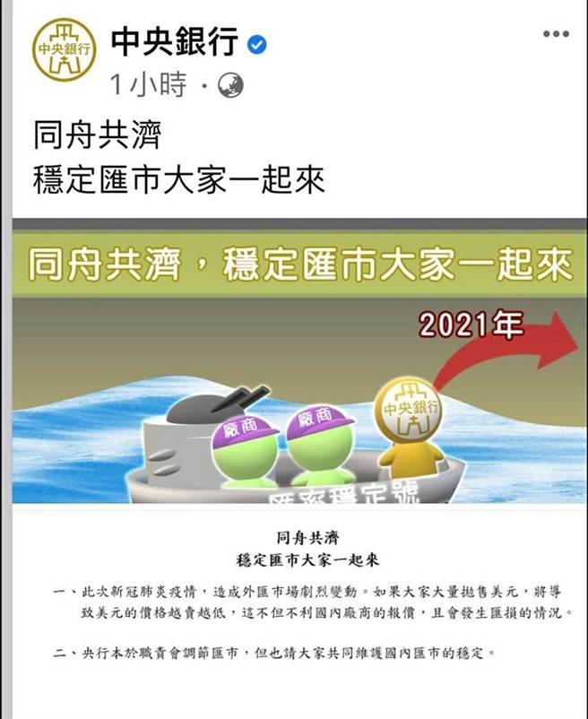 央行不仅积极对新台币匯率阻升,另一方面也对国内厂商信心喊话,7日晚间央行在脸书上贴出「央行匯率稳定号」的Q版画风文宣,不到1小时内就被金融业界疯传转载。