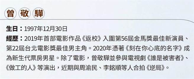 从曾敬骅拍的电影《返校》、《刻在你心底的名字》,以及电视剧《做工的人》等作品来看,确实能对他这些想法产生共鸣,但回头一想,曾敬骅其实才刚过二十三岁生日,他坦白:「之前都没有在过(生日)。」现在成了社会新鲜人,除了拍戏,平时曾敬骅就是早起去外面走走、到传统早餐店吃早餐、还有慢跑跟游泳,前阵子还开始学吹奏小号。