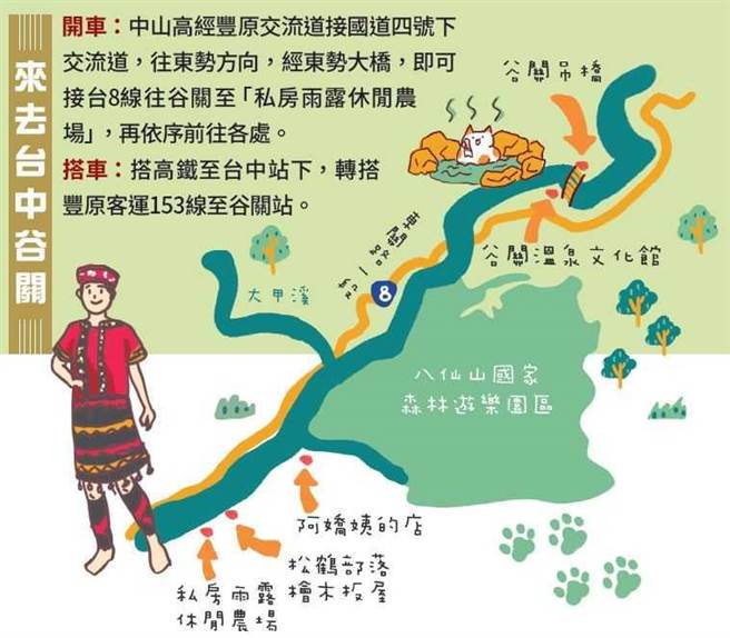 离开松鹤部落,开车上路前进「谷关温泉」。谷关温泉是日本人在台开发的第二个温泉区,水质好、属弱碱的碳酸氢钠泉,还拥有「生男汤」的传说。这一带的温泉旅馆林立,已有歷史感的「谷关吊桥」将两边的商圈串连起来,走上了石阶梯,触目所及的日式木造建筑、日式灯笼、祈愿墙,让人有来到日本的错觉。