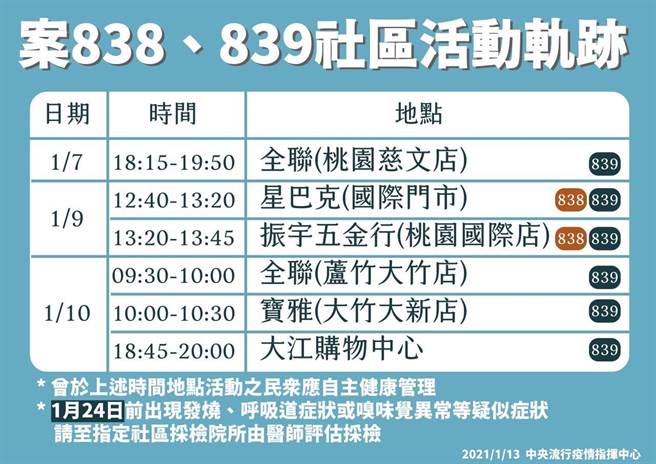 中央流行疫情指挥中心昨(12日)揭露桃园爆医护院内感染,医师与护理师女友2个本土病例,今(13日)再公布本土确诊个案(案838、案839)社区活动轨迹,到过全联、星巴克、振宇五金行、宝雅、大江购物中心。指挥中心呼吁曾到过的民眾应自主健康管理;24日前出现发烧、呼吸道症状或嗅味觉异常等疑似症状,须至指定社区採检院所由医师评估採检。