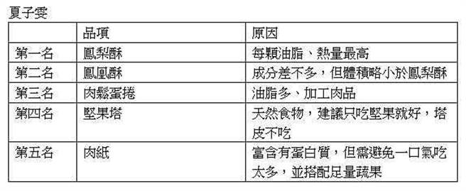「我觉得凤梨酥最恐怖!」夏子雯说,以知名的凤梨酥品牌为例,每颗45公克重,热量就高达200大卡左右,大约等于半碗饭,成分包括麵粉、进口天然奶油、蛋、砂糖、凤梨、冬瓜、盐,这样的成分排列组合也暗藏玄机。