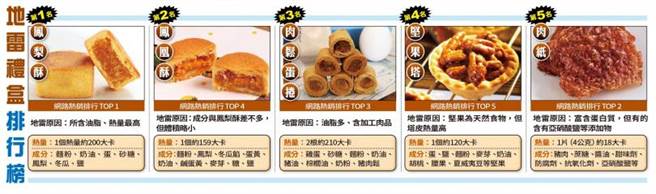 本刊特别找来网路票选2021年最受欢迎的零食礼盒前五名,分别是凤梨酥、肉纸、肉松蛋卷、凤凰酥、坚果塔,邀请营养师夏子雯、程涵宇一起分析、评选,列出她们认为最地雷的礼盒排行榜。