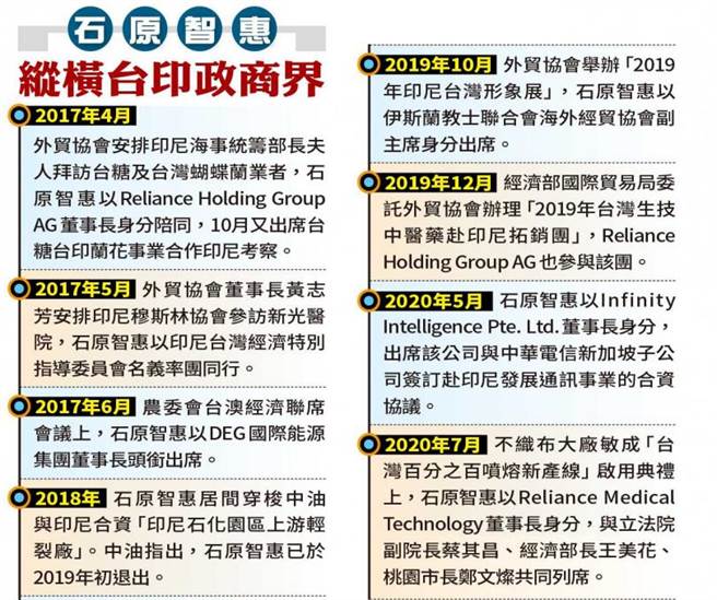 小英政府自2016年起推动新南向政策,国民党立委林思铭接获爆料,年约50多岁的石原智惠身分神秘,穿梭在各个国营事业在印尼的投资案,「她讲话是女声,当初的爆料人士也指出她是个女生。」奇妙的是,一位绿营人士则坚持「他(石原智惠)是男生。」根据本刊掌握石原智惠的公开场合照片,个子不高的他,体型圆润,总是一贯的西装男士装扮。