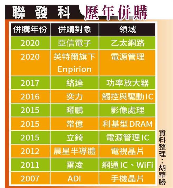 回顾过去4个月,联发科已发动3次併购。先是去年11月间,联发科子公司立锜以24.3亿元併购业界龙头英特尔的Enpirion电源管理晶片产品线,1个月后,另一间子公司络达又以4.95亿元认购工业乙太网路晶片公司亚信电子的私募股1239.53万股,成为在亚信电子持股2成的大股东。