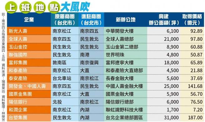 瑞普莱坊市场研究暨顾问部总监黄舒卫表示,整体而言,2026年左右,北市精华地段新建大楼的楼地板面积,将新增逾20万坪的办公面积,开发价值上看5000亿元;以每4坪空间安置一名员工的保守估计,就有5万个工作岗位要大迁徙,「不仅影响商圈零售和餐饮需求,更带动水电、装潢、搬运与办公家具等行业。」台北市金融街廓的面目一新,指日可待。(完)