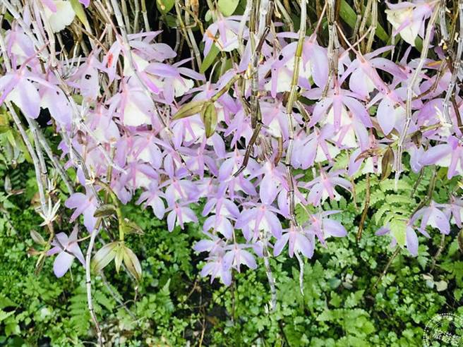 香草花园生态池的「瀑布兰」,为天宫石斛兰又称为倒吊兰,属兰科石斛兰属,每年4月进入花期,原产地印度、斯里兰卡和中国南部各地,分布广泛,生长依靠附生,以气生根攀附树体往上生长,茎节处入春开花,粉色系花瓣及白花垂坠,由于生长往下成长,花开形成瀑布状,所以又被称为瀑布兰!目前正值花期,花期预计2周,约在4月底前结束!