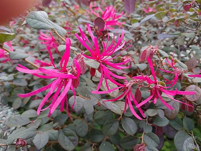 红花檵木(图:臺北市工务局公园处提供)乍看之下以为是红色流苏的「红花檵木」,丝带样子的红色花朵开于枝端,也好像处处结了红彩,因此在花市俗称为红彩木。花色鲜艷、花形特殊,叶片色彩也能和花朵呼应,是花叶俱美的优质观赏树木。