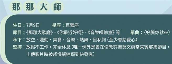 其实那那的工作很累,脚本、剪接都要自己动手,真的忙起来怎么办?就碎碎念一下,当作抒发吧,「不会碎碎念的人也太做作了,当然可能也真的有这么完美的人,但我不是,念出来才快乐。」念完了,吃点好东西、回到自己安静的空间、睡个觉、醒了来段热舞,不好的情绪就都释放出来了,绝不积在心里让自己内伤。