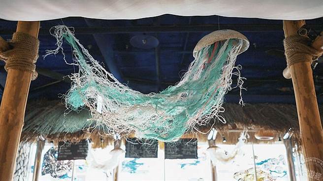 渔网塑胶袋,经过清洗后做出的塑胶水母,与店内的窗景画相呼应(图/臺虎精酿提供)