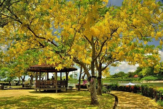 位在新营区长荣路、健康路与三兴街一带的运动公园,也有一条阿勃勒步道,总长约50公尺,每到6月都会飘起浪漫黄金雨,金黄色花朵被风吹落后铺满整条步道,成为热门的拍照打卡夯点!东区的成大校区、归仁区的高铁臺南站、白河区大山宫旁的竹管厝等等,届时也都会出现阿勃勒盛开的美景。