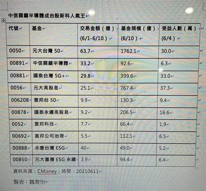 2021年6月以来前十大台股ETF人气王出炉。据CMoney统计至2021年6月11日,交易量前四大ETF为元大台湾50、中信关键半导体ETF、国泰台湾5G+、元大高股息,交易金额都逾25亿元,法人观察,ESG、5G、高股息等类型最受投资人青睐。