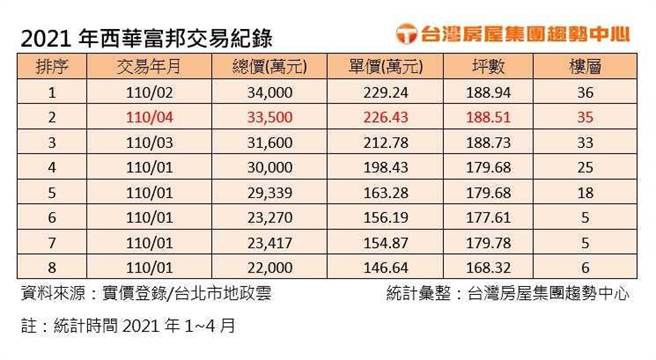 台湾房屋集团趋势中心执行长张旭岚表示,西华富邦今年成交共8笔,平均单价约185万,而该户属于「西华富邦」的中高楼层,对照相邻楼层过去成交价落在每坪223~229万元,所以这次成交价格属于合理行情范围内。