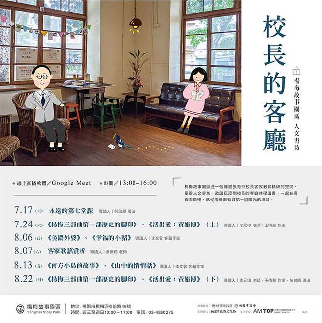 杨梅故事园区于暑期将于7月17日、24日;8月6日、7日、13日、22日将推出线上「校长的客厅人文书坊系列讲堂」。讲师将邀请彭启原、李元璋、王倩慧、萧佩茹、李文蓉等人,导读赏析影片、书籍、歌谣及绘本,带领民眾认识杨梅在地文史及客家文化,每场讲堂的尾声后,还将有抽奖活动,包括:图书礼券、绘本文具组。