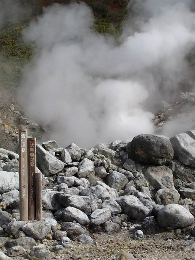 由于地底的水蒸气与岩浆不断地从缝隙中冒出,空气中笼罩着硫磺气味与白色烟雾,让人彷佛置身在地狱,因此被称为「云仙地狱」。这一区有大大小小30多个地狱,包括大叫唤地狱、御丝地狱、清七地狱等,中间有整备良好的步道,绕一圈约一小时。途中有利用地热喷气设置的蒸足场,买颗用地狱蒸气蒸煮的温泉蛋,感受在地狱小憩一下的气氛。