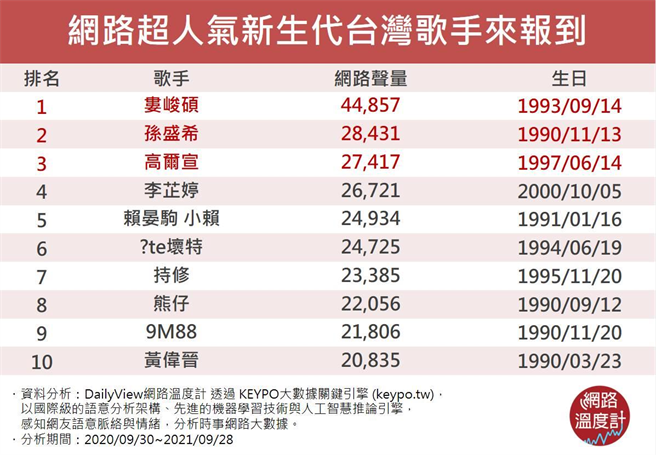 今天的DailyView网路温度计就透过《KEYPO大数据关键引擎》调查,1990年(含)后出生的,网友热门讨论、备受期待的台湾新生代歌手分别有谁,来看看你喜欢的歌手有没有上榜吧!