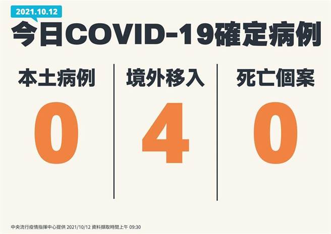 中央流行疫情指挥中心今(12)日公布国内新增4例COVID-19确定病例,均为境外移入;另确诊个案中无新增死亡。