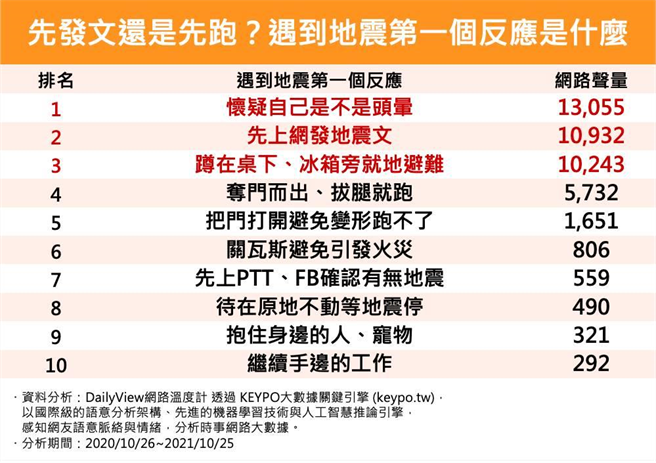 今天《DailyView网路温度计》就透过《KEYPO大数据关键引擎》调查,网友热议「地震来了第一个反应」,快看是不是也说中你!