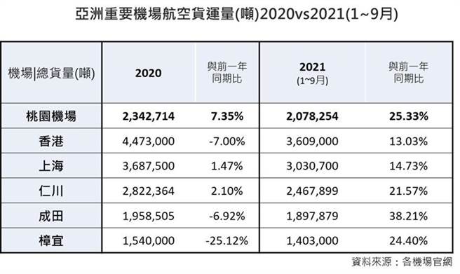 机场公司表示,桃园机场货运持续成长,货运量较去年同期增加25.3%,成长率在东亚主要机场排名第二。后续在5G等远距商机持续带动高科技产品出口,加上欧美耶诞及新年假期将至,海运塞港缺柜缺工状况未有缓解,导致货物由海转空转单效应持续、国籍航空陆续引进货机扩大运能等因素影响下,货运热络持续成长。