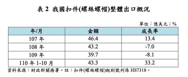 台湾为全球第三大扣件出口国次于中国大陆及德国,出口金额于2018年达到歷史高峰46.4亿美元后,受美中贸易衝突与COVID-19疫情影响,出口金额略有下滑。经济部贸易局25日公布最新统计,受惠于全球景气復甦及钢价上涨带动我扣件出口成长,今年以来随着全球经济活动回温及钢价大幅上涨,推升我国扣件出口动能,1至10月出口金额成长33.2%。