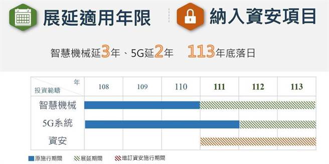 经济部表示,智机、5G投抵原本为短期经济点火措施,但中美贸易及疫情相继爆发,致全球经济低迷不振,企业营收及获利衰退,延宕智机投资脚步,原订的三年适用年限不够企业落实投资规划,有必要展延三年。而政府规划2024年释出第二阶段5G系统商用频谱,及5G开放网路架构技术(O-RAN)亟需政策引导,再展延二年。