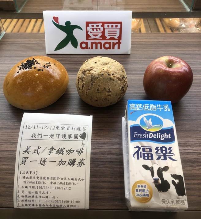 爱买配合地方卫生局在适合的区域设置疫苗接种站,有效提高疫苗接种率,今(9日)再宣布在基隆店外新增台中復兴店加入接种疫苗的行列,将于12月11日、12日13时至16时设立疫苗快闪站,提供自制烘焙麵包、苹果、保久乳饮品和现煮咖啡买1送1加购券做为「健康礼」,每日各限量100份,鼓励民眾前去施打疫苗。