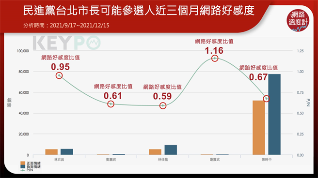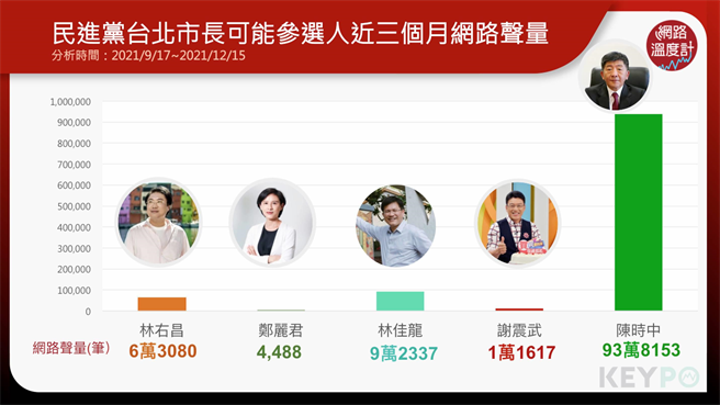 根据《KEYPO大数据关键引擎》(2021/09/16~2021/12/15)调查统计,目前传出的民进党五位台北市长可能参选人网路声量: