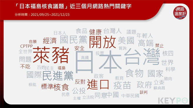 透过《KEYPO大数据关键引擎》调查(2021/09/25~2021/12/23),18日公投结果出炉后,就有人开始讨论核食议题。20日民进党立委邱志伟提出,日本福岛食品是科学问题,检验安全无虞的品项可先开放,如今想要加入CPTPP,关键在于日本,解决福岛食品禁令问题不能再拖,还说如果比中国慢一步会显得没有诚意。对此,不少网友解读福岛食品解禁指日可待,虽然有网友觉得若用科学检验,能确保食品吃入人体之后安全无虞,认为开放福岛食品应该没问题;但同时也有网友表示,未来民进党政府恐怕又要强渡关山,掀起热烈讨论,留言「莱猪都愿意吃了」、「核能好怕怕,核食好棒棒」、「莱剂是维他命,核食是营养品」等等,创下声量高峰,共计5456笔。