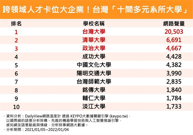 今天《DailyView网路温度计》就透过《KEYPO大数据关键引擎》排名拥有10间以上院所、或是40个系所的大学,看他们如何发挥学校资源,让学生一毕业就成为企业抢着要的跨界人才!
