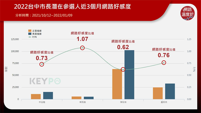 透过《KEYPO大数据关键引擎》调查近3个月(2021/10/12~2022/01/09),网友讨论的民进党潜在台中市长候选人,与国民党将争取连任的现任台中市长卢秀燕比较,网路好感度第一名是这次担任林静仪后援会总干事的蔡其昌,比值1.07。蔡其昌日前曾说,自己是民进党内「最强台中市长提名人选」,还说自己是卢秀燕最强对手,高网路好感度也印证这样的说法,蔡其昌这回在中二补选扮演组织动员的关键角色,替民进党赢得战役,有没有机会因此出线披袍上阵,就看总统蔡英文最后如何定夺。