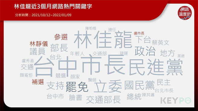 因为中二补选而声势水涨船高的不只蔡其昌,前台中市长林佳龙近日也是曝光度、讨论度大增。林佳龙自从太鲁阁号翻车事件请辞交通部长,沉潜多时,但他的下一步始终备受外界关注,而这次接下林静仪竞选总部主委之初,外界就开始猜测是否为復出起手式,而且身为补选团队的主要操盘手,当然功不可没,网路上还传出支持林佳龙参选台北市长的呼声,声量不仅比蔡其昌高,目前网路好感度也仅微幅落后卢秀燕。透过网路热门关键字来看,林佳龙的关键字出现「补选、林静仪」等,确实因为此役拉抬出一波声量,随之而来的也带动选市长的呼声,不少人也都颇看好林佳龙未来的復出选情,因此关键字出现「选市长、参选」等等,成为2022县市长选举的热门人选。