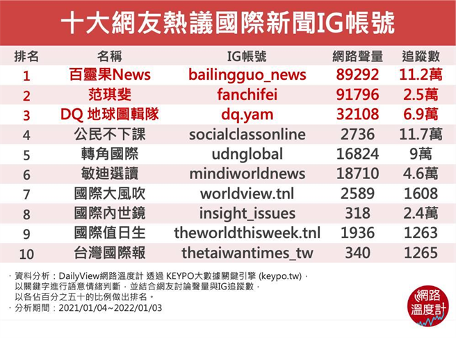 系统观测上万个网站频道,包括各大新闻频道、社群平台、讨论区及部落格等,针对讨论『国际新闻IG帐号』相关文本进行分析,并根据网友就该议题之讨论,作为本分析依据。