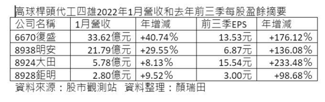 高球杆头代工产业已公告营收的龙头復盛(6670)今年1月营收33.62亿元,年增40.74%,明安(8938)21.79亿元,年增29.55%,鉅明(8928)2.80亿元,年增9.52%。