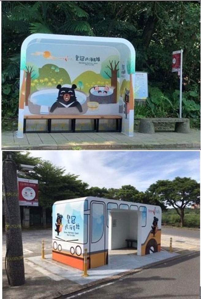 营造整体北海岸观光意象及友善乘车旅游环境,包含皇冠北海岸线车辆外观以「喔熊组长」结合北海岸特色,如喔熊骑单车与野柳女王宝宝迎宾、中角湾衝浪、感受朱铭美术馆艺术氛围等;提升「金山游客中心站」候车环境,融合金山万里温泉、秋季限定金花石蒜以及女王宝宝一起开心泡汤的意象,打造全新候车空间,另有「三芝游客中心」及「野柳地质公园」2座候车亭,喜欢拍照打卡、搜集喔熊的粉丝千万别错过!