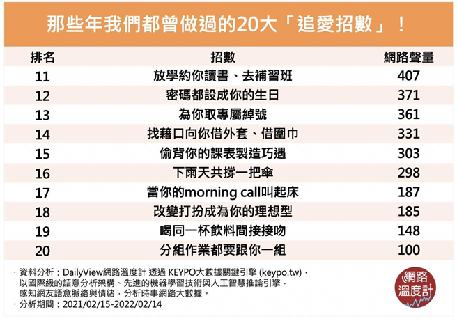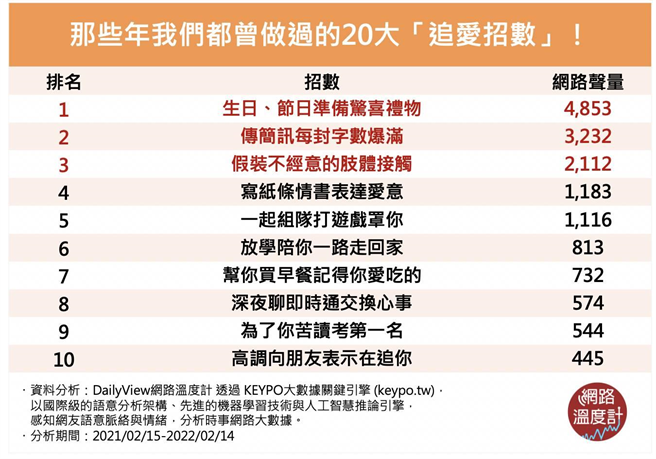 许多观眾看完都纷纷想起学生时期的自己,用尽各种方法只为了追求喜欢的人,虽然现在看来相当青涩,不过回想起来仍然是美好的回忆。今天《DailyView网路温度计》就透过《KEYPO大数据关键引擎》调查,网友热议以前学生时代都会使用的追爱招数,看着看着是否想起了当年的初恋对象呢?