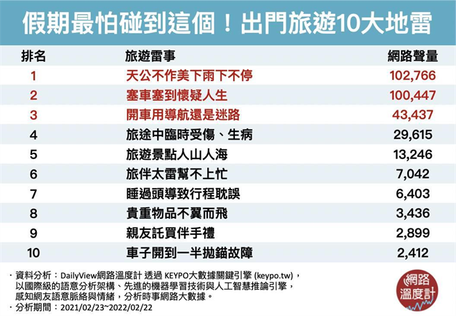 今天《DailyView网路温度计》透过《KEYPO大数据关键引擎》为你整理网友讨论旅行时最讨厌遇到的10种情况,想要避免出门就踩雷,这篇文你一定要赶快收藏!