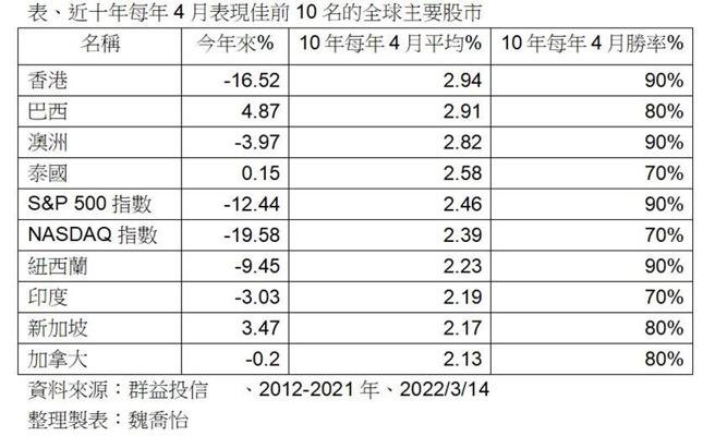 时序即将来到4月,过去一周,市场焦点仍在俄乌战事的变化,虽俄国持续用武力进逼,但双方都透露有坐下谈判意愿。就过去经验来看,近十年每年4月全球主要股市平均月涨幅表现都正报酬,尤其是亚股、东协,法人表示,投资人可超前部署相关市场掌握四月行情契机。据群益投信统计资料显示,近十年每年4月全球主要股市平均月涨幅表现都正报酬,依序分别为香港2.94%、巴西2.91%、澳洲2.82%、泰国2.58%、S&P 500指数2.46%、NASDAQ指数2.39%、纽西兰2.23%、印度2.19%、新加坡2.17%、加拿大2.13%;整体来看,金砖四国有三国上榜是全球三大区域中表现最好的,东协也表现突出,而美股也表现不错。群益印巴双星基金经理人陈沅易指出,印度3月10日公布5邦议会选举结果,总理莫迪所属BJP党取得4邦执政,包括最为关键的UP邦,此结果表示民意对莫迪施政仍算满意,有助延续目前经济发展方向,对股市中长期有利。巴西部分,由于俄罗斯被MSCI & FTSE等指数编制公司移出新兴市场指数权重,以目前的国家权重转移到新兴市场的其他国家,拉美将获得近12亿美元,巴西占近 8亿美元则可受惠,能源、材料和金融行业可能是主要资金移动受惠行业。今年印度和巴西两个主要新兴市场表现仍可持续关注。 群益东协成长基金经理人高浩伟指出,货币政策相对宽松将支撑股市表现,今年来东协股市走势,相较其他地区,呈现稳健向上,判断基期低及筹码优势为主因,加上权值类股金融、能源在现阶段的时空背景下表现特别突出,可见的未来应该可以维持此趋势。建议配置产业为金融、通讯服务、房地产。国家方面相对看好马来西亚,印尼;看好产业方面金融类股及能源类股。 在越南股市部份,中国信托越南机会基金经理人张晨玮表示,欧美经济体由于通膨压力居高不下,今年货币政策收水势在必行。但越南由于通膨维持相对低檔,财政刺激仍有施行空间,政府于2022年初通过史上最大经济刺激方案,其中高达50亿美元的基建投入有望拉抬房地产、金融及原物料类股。另一方面,由于越南已是东南亚接种新冠疫苗人口比例最高的国家之一,政府预计15日起开放旅客入境,此举有助旅游服务业逐步復甦。