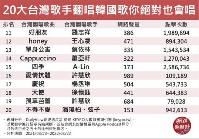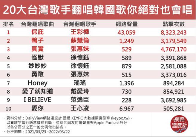 今天《DailyView网路温度计》透过《KEYPO大数据关键引擎》,盘点综合网路声量及YouTube点击次数,盘名10大台湾歌手翻唱的韩国歌,不管是轻快舞曲还是浪漫情歌,每一首都唱出自己的味道。