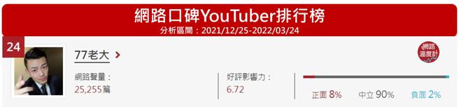 77老大也荣登网路温度计公布的「网友热议十大未婚帅气YouTuber」第1名,打败有YouTuber界「蓝正龙」之称的阿杰、暖男阿滴和「反骨男孩」团长酷炫,在眾多天菜YouTuber中脱颖而出。