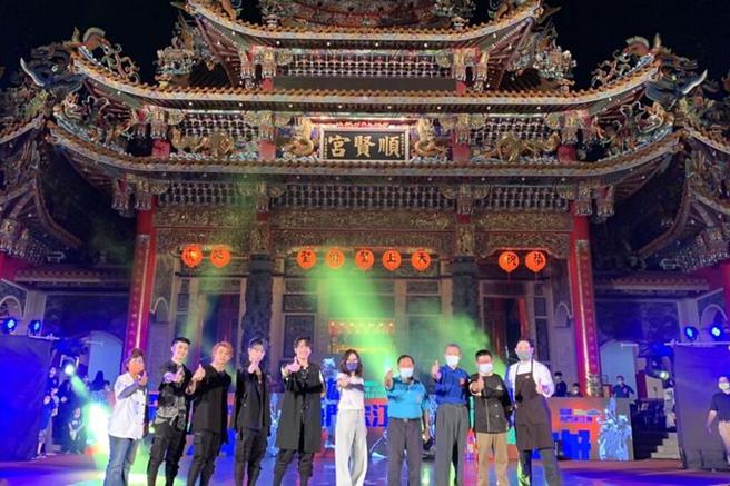 ▲观光局长周玲妏(中)、顺贤宫黄富义董事长(右4)与总舖师、B.T.O.D共同谢谢民眾热情支持宋江大宴。 图:高雄市政府观光局/提供