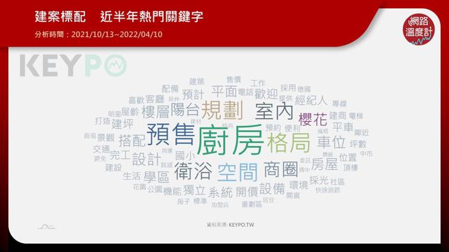 购屋时若不想要烘碗机,留言网友也有提供其他方法:「反正配的都是烂货,乾脆退掉,自己装喜欢的」、「可以客变全部都不要」、「要加价换」、「很多高总价的都是给你提货券,自己去厨具公司加钱讨论整体规划」,表示厨具配备上与建商仍保有一定的规划弹性。建案标配热门关键字 以厨房、卫浴最为大宗透过《KEYPO大数据关键引擎》调查(2021/10/13~2022/04/10)来看【建案标配】的热门关键字,可以发现,民眾最在意的就是厨房和卫浴空间,尤其当建案原本配置的瓦斯炉、卫浴的马桶、洗脸盆位置并不好时,民眾就会开始讨论「客变」的可能性,另外像是「格局、空间」也是民眾积极讨论的重点,还有台湾厨卫领导品牌樱花「SAKURA」也有上榜,主因是商品较符合亚洲人使用,而且与建商多有配合,有不少建案标配都是直接选用樱花「SAKURA」。