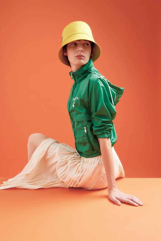 此次该系列服装条纹主要以绿、白、黑、蓝、红、黄、橙色为主,主要运用于服装、配件当中,除此之外本次服装部分也运用许多更具夏季气息的元素,如,女装部分运用许多飘逸的丝绸、具毛圈效果的针织品营造休閒轮廓,男装部分则休閒衬衫、鞋履与短裤呈现,同样的色调也运用配饰当中,其中为配合本次Tropico系列,在配件材质方面除尼龙、皮革、Saffiano、麻布等等外,也有最具夏日情调的Raffia 拉菲亚草编织款,如品牌经典 Triangle肩背包也特别为此次Tropico推出Raffia 拉菲亚草编织款。