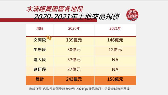 信义全球资产统计台中水湳经贸园区土地买卖实价登录已揭露资讯,2021年交易规模158亿元,自2020年起连续两年交易规模都破100亿元,2020年建商抢进园区内大面积土地,让交易总金额衝至243亿元,2021年因建商已多数抢先插旗,可购土地相对量少下,交易规模虽仅158亿,但破百亿的规模仍排名台中市各重划区的前三名,是建商锁定必争之地,包含宝辉、丰邑、总太、达丽、远雄等知名建商在插旗行列中。