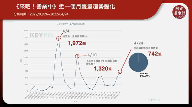 分析区间:本文分析时间范围为2022年3月26日至2022年4月24日。资料来源:《KEYPO大数据关键引擎》拥有巨量资料,以人工智慧作语意分析之工具资料搜集范围:累积超过10亿笔以上的网路数据库,其内容涵盖新闻媒体、社群平台、讨论区、部落格、地图评论等网站。研究方法:系统观测上万个网站频道,包括各大新闻频道、社群平台、讨论区及部落格等,针对讨论『来吧!营业中』相关文本进行分析,调查「网路声量」(注1)作为本分析依据。*注1 网路声量:透过『KEYPO大数据关键引擎』,计算社群讨论及新闻报导提及的文章则数,声量越高代表讨论越热,能见度越高。