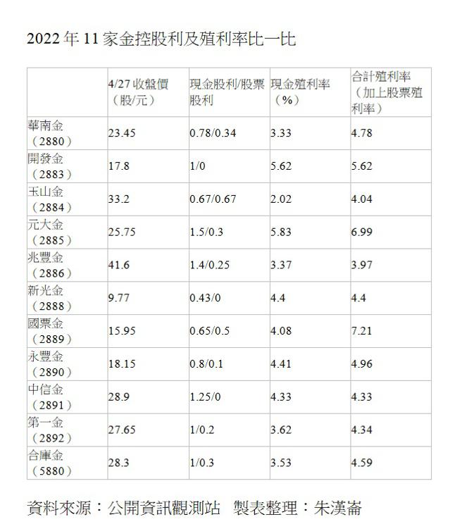 时序已近四月底尾声,国内上市金控里,仅剩富邦金、国泰金、台新金三家金控尚未公布2022年的股利发放,其他11家金控的发放结果全部都已揭晓,根据目前各金控所公布的结果,若以4月27日的收盘价换算,现金殖利率将由元大金以5.83%居冠,开发金则以5.62%居次。而倘若再加计股票股利的「股票殖利率」,则总殖利率水准,将由国票金以7.21%居冠,元大金则以6.99%居次,开发金5.62%居第三大,并遥遥领先其他金控,而不论是以哪种殖利率指标评比,元大金都居前二大。儘管富邦金、国泰金尚未揭晓股利发放的结果,不过倘若以去年富邦金分派每股4元(包括3元现金股利、1元股票股利),和国泰金发放每股2.5元的情况,和目前两大金控分别为每股73.2元、62元的股价来推算,两家金控今年的现金殖利率水准超过5%的机会不高,因此,元大金、开发金拿下金控现金殖利率前二大,以及国票金、元大金拿下总殖利率水准前二大的结果,应可说已确定。在比较殖利率水准上,向来以现金殖利率最具代表性,因为直接以现金股利去换算股价即可得到结果,相对而言,股票殖利率则由于配发的股票股利并不像现金股利就不会变动,换言之,会随着股价的变动,股票股利的殖利率变动复杂度较高,但由于金控业者有许多基于资本适足率的考量,因此其股利都会伴随股票股利,也使得现在除了现金股利之外,加上股票殖利率的「总殖利率」水准,来检视金控股票的投资报酬率,会更加完整。根据目前11家金控所揭露的现金殖利率的水准,和27日的收盘价换算,元大金、开发金是唯二超过5%的2家金控,而新光金、国票金、永丰金、中信金则超过4%,第一金、合库金、兆丰金则超过3%。倘若再以加上股票股利的总殖利率水准来检视,每家金控依照其股票股利占总股利水准高低的不同,就会出现不同的结果,分别以国票金7.21%、元大金6.99%、开发金5.62%居前三大,而包括玉山金、新光金、永丰金、中信金、第一金、合库金,则超过4%。尤其是对于很多想「存股」金融股的投资人,金融圈人士指出,这时就不能只看股价,而是要看「殖利率」,才是评比金融股的存股投资是否划算,最为重要的指标。倘若一家金控的股利配发,追不上其股价成长的速度,此时殖利率就会每况愈下,换言之,此时该金控的股价和股利配发一对比下来,很容易会令人觉得「买贵」。但倘若殖利率越来越高,则代表其股利配发的水准已追过其股价成长的速度,甚至可说其股价有被「低估」之虞,也可说这种金控股买起来,也相对较为「便宜」;金融业者也指出,7月以后,就是上市公司除权息旺季,想要投资金控股的投资人,除了赚价差,不妨参考一下其殖利率水准,才更能物超所值的「存股」。