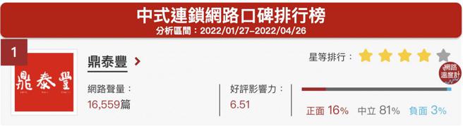 ▲「鼎泰丰」位居网路温度计的中式连锁网路口碑第1名。